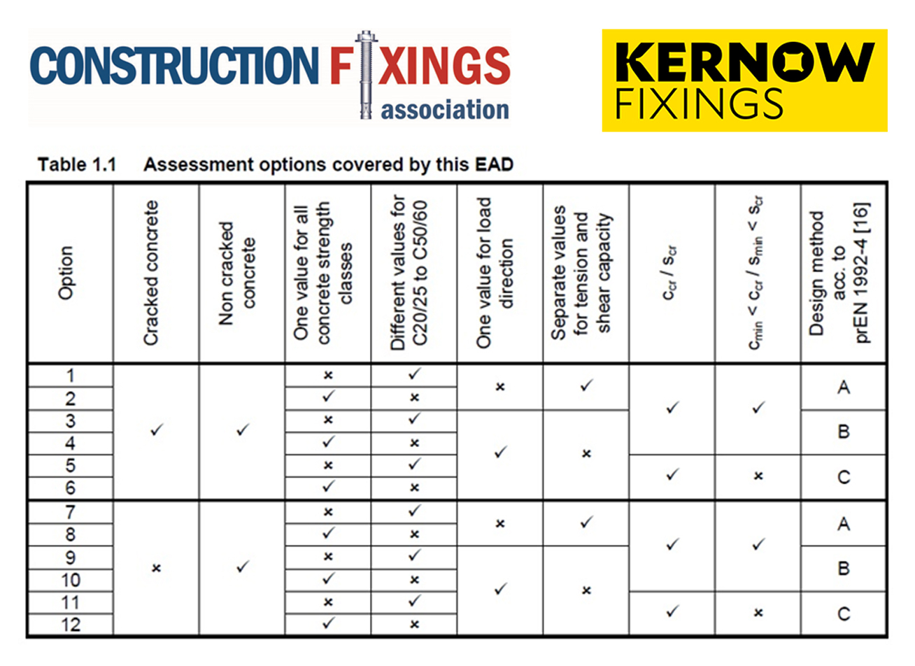 A product with an ETA will be clearly labelled and will feature an option number. ETA’s are split into 12 options which dictate what parameters they are suitable for, such as for use in cracked or non-cracked concrete. For those specifying anchors, ensuring the chosen anchors’ ETA number correlates with its application is crucial in the safe selection of an anchor. For more information on ETA options, see the table below.